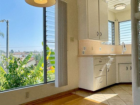 Mid century modern 2 bdrm with tree house panoramic view in 6 unit bldg. Floor to ceiling living room windows, oak hardwood floors throughout, central heating and A/C, tile kitchen counter tops, large bedrooms with mirrored nearly wall to wall closets, linen closet and storage in the hall. stove, fridge, garbage disposal, laundry room in the building, controlled access with remote controlled security gate, and one onsite parking space included (second space available). Quiet building on the nicest block in the area, centrally located near Venice Blvd. and La Brea with close transportation, shopping and nearby museums. No smoking anywhere in or on the property. This apartment is offered unfurnished only and is available now.