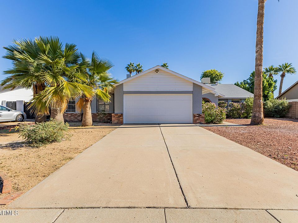 NO HOA! HUGE nearly 1/4 acre lot! Lovely 4-bedroom home on a quiet cul-de-sac! You're greeted by a 2-car garage, a sizeable front yard, and charming brick accents. Discover a sunken living room with vaulted ceilings, a soothing palette, wood-look flooring, and a cozy brick fireplace. The well-appointed family room has skylights for abundant natural light. Culinary adventures await in the kitchen, equipped with solid surface counters, a walk-in pantry, a serving window, and ample wood cabinets with crown moulding. Enjoy warm afternoons in the sunroom, perfect for enjoying the warm Arizona weather year-round. The main bedroom has an ensuite with dual sinks and a walk-in closet. Spend enchanting evenings in the backyard, complete with a spacious covered patio. Don't miss out on this gem!
