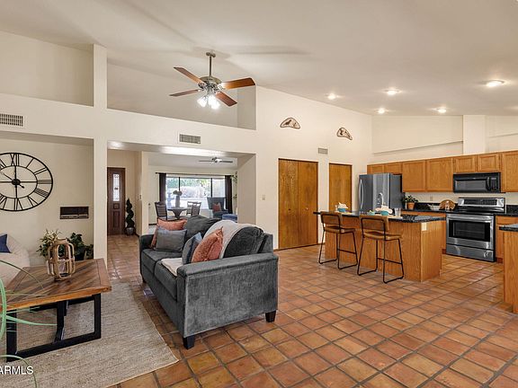 Welcome to this inviting 3 bedroom, 2 bathroom home offering both charm and functionality. As you enter through the private front courtyard you'll find a spacious floor plan that is enhanced by Saltillo tile throughout most of the home and a warm beehive fireplace in the family room. The kitchen is designed for both style and functionality with entertaining being the focal point - including black granite countertops, stained cabinetry, a large center island with sink, stainless steel appliances, eat-in dining area as well as a separate formal dining room! Don't miss the Arizona Room opening to the large, fenced backyard featuring a sparkling pool and spa, all backing to a natural wash for added privacy. This home features a split bedroom plan with exterior exit from secondary bedroom. Additional highlights include an RV gate with parking pad, a 3-car extended garage, water softener and no HOA! Located close to Fountain Hills High School as well as local shops and restaurants, this home is ready for its next owner's personal touch!