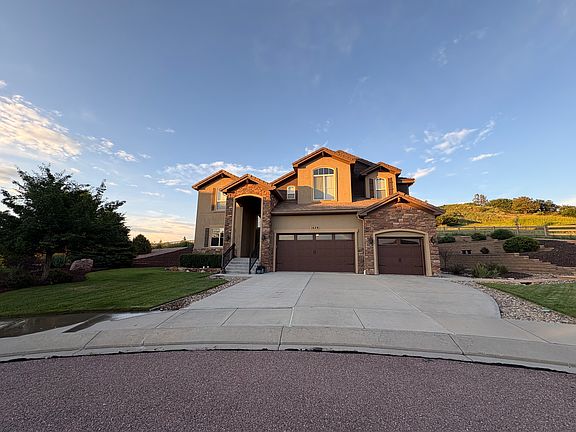 Beautiful D20, 2-story presidential home on the Flying Horse Golf Course, in a quiet Cul-de-Sac with Pikes Peak Views! You'll immediately notice how wide this home's property is, giving it a feeling of taking up much of the cul-de-sac on its own. This house is perched on a high point in the community. Then Walk to the bluff in the backyard and enjoy the 360-degree panoramic views. Front covered porch welcomes you to the grand foyer with 18 ft ceilings. Enjoy a bright and open floor plan, with hardwood flooring, new carpet, a large living room with beautiful gas & stone fireplace, soaring hand-troweled walls & ceilings, and an immense wall of windows. Natural light flows through the gourmet kitchen w/ hardwood, Stainless Steel appliances gas cooktop, double ovens, 42" cabinets w/crown, granite, butler's & walk-in pantry w/ open access to both large formal & informal dining spaces. Take your living outside w/ the privacy & tranquility of the professionally landscaped, and gorgeous views of the Golf course, Mountains with a Fireplace, and sitting area to take it all in! Large 3 car garage w/ 8' tall double door, quiet main level bedroom/office and full bath. Use the open wrought iron staircase to enter the master retreat which features mountain and golf course views, a sitting area, a walk-in closet & 5 piece bath. The upper level also features a loft, 3 additional bedrooms, 1 full bath & a large laundry room w/ sink, and ample cabinets. Complete w/ a spacious finished basement w/ 10' ceilings, 6th bedroom, a full bath, pre-plumbed for a wet bar, and large storage area. This home includes a high-end HVAC system with a built-in UV light that kills germs and bacteria, Dual 98% modulating high-efficiency Furnaces, AC, & Humidifier. Easy access to I-25, USAFA, Denver, Ford Amphitheater, new King Soopers marketplace, ASD20, Discovery Canyon K-12 school, and close to lots of great shopping and dining. Come and see this home today to experience the serenity this home offers!