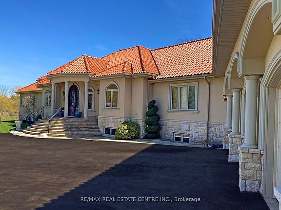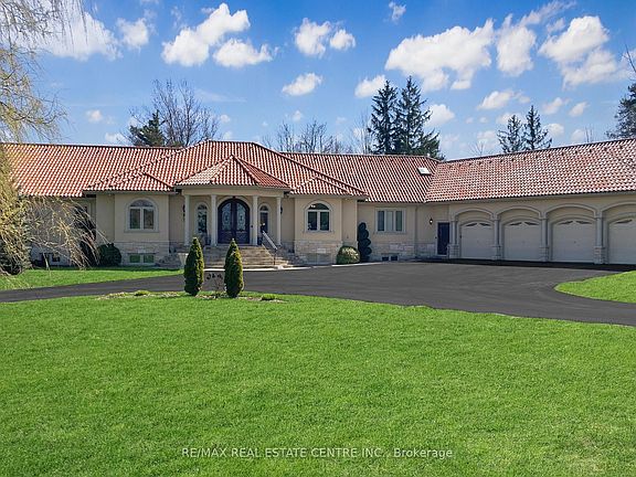 Discover your personal paradise nestled in the enchanting beauty of Terra Cotta-a remarkable 11-acre estate featuring a nearly 2-acre spring-fed private lake brimming with wildlife. This Spanish-style raised-ranch is perfectly complemented by a striking terra cotta tile roof. Step inside to an expansive open-concept foyer with a 14-foot ceiling, leading into a family room highlighted by a floor-to-ceiling stone fireplace. The home boasts 18 rooms on the main level, showcasing vaulted and recessed ceilings. The layout includes 4+1 bedrooms, with 4 of them having en-suite bathrooms, totaling 5 bathrooms. The main level features elegant travertine tile flooring, while the living room, dining room, bedrooms, and office are adorned with walnut hardwood. Multiple walkouts lead to a large deck overlooking the vast lawn that gently slopes to the private lake. The bright +1 bedroom with an en-suite and private walkout offers a tranquil retreat for guests, family, or as a nanny suite. Enjoy the comfort of a high-end, dual-redundant in-floor radiant heating system that warms the entire home and the 4-car garage, providing consistent warmth even on the coldest days while promoting an eco-friendly lifestyle. Relax with family and friends by the freshwater pool, which is fully equipped for conversion to saltwater. Welcome to your dream home, where luxury meets tranquility, all just 10 minutes from downtown Georgetown, 8 minutes from Northwest Brampton and 30 minutes from Pearson Airport.