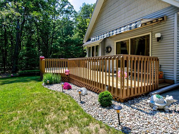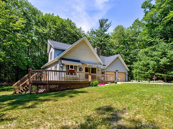 Welcome to this spectacular opportunity to live on 3 wooded acres near Lake Michigan beaches and Riley Trails Park! The main level features the living room with cathedral ceiling, fieldstone fireplace, and slider to huge wrap-around deck, kitchen including all appliances, dining area with bay window, spacious primary suite, full bath, and slider to deck, and convenient laundry. The upper level offers a loft area, second bedroom, and full bath. The unfinished lower level is ready for a family room, bedroom, bathroom, plus storage. Newer furnace, air conditioner, and roof, extra deep garage, and space for an outbuilding/pole barn. Enjoy the outdoors relaxing on your tranquil deck, gathering by the firepit, or playing in the large yard or woods. Come see this great home and make it your own!