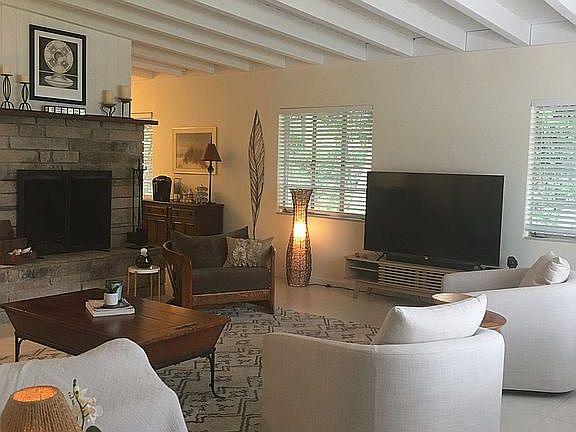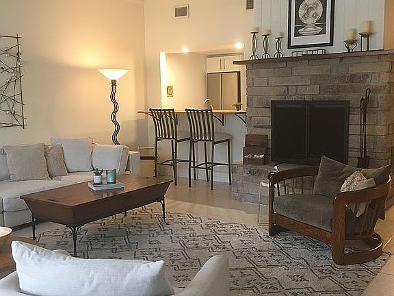 Classic Mid Century Modern home freshly painted inside and out. Newer galley style kitchen with butcher block counter tops and stainless steel appliances. Gorgeous vaulted ceilings and spacious living area with beautiful stone wood burning fireplace. Roof installed 1999 and central heat and air with new ductwork installed the same year. Side patio for grilling or enjoying a day in the sunshine. Beautiful landscaped front yard with sprinkler system connected to reclaimed water. Huge backyard that could easily accommodate a new pool or create your own private oasis!