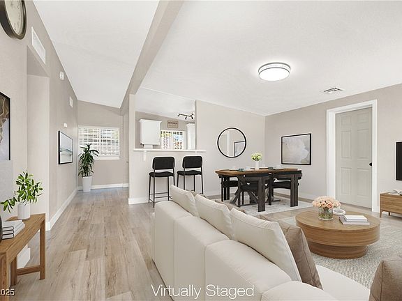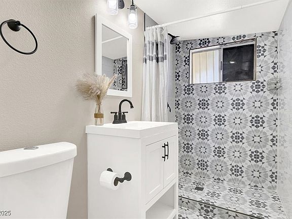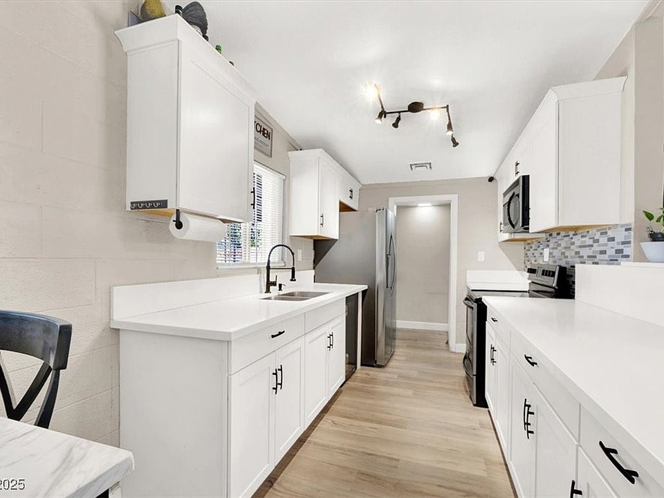 Located minutes from the I-15 and Downtown Las Vegas! 3 bedroom, 2 bath home with modern renovations and an open-concept floor plan. Wood-look luxury vinyl plank throughout the main living area and kitchen. Kitchen equipped with quartz counters, white shaker cabinets (with matte black hardware), SS appliances and hand selected lighting! Modernized bathrooms have custom tiled flooring and showers, newer vanities, mirrors, and fixtures! additional upgrades include front door with glass inset, NEW electrical panel, New mini-split A/C in primary bedroom, alarm system and cameras will be included. Home is fully fenced with RV potential. Backyard has great curb appeal with a large covered patio, artificial turf, storage shed and spacious enough to add a pool! Oversized driveway and more. No HOA and conveniently located close to schools, shopping and freeway access. Call it HOME!!