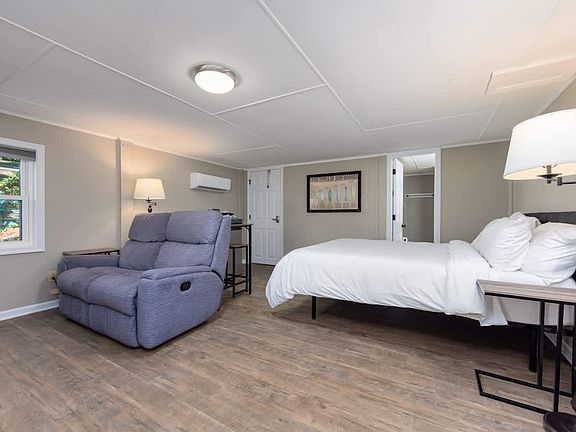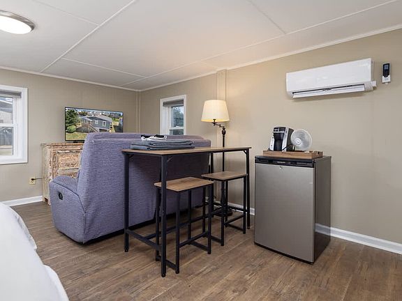Queen bedFlat screen tvCharcoal and propane grillWalk-in showerAccent chairDriveway parking for carsMini fridge