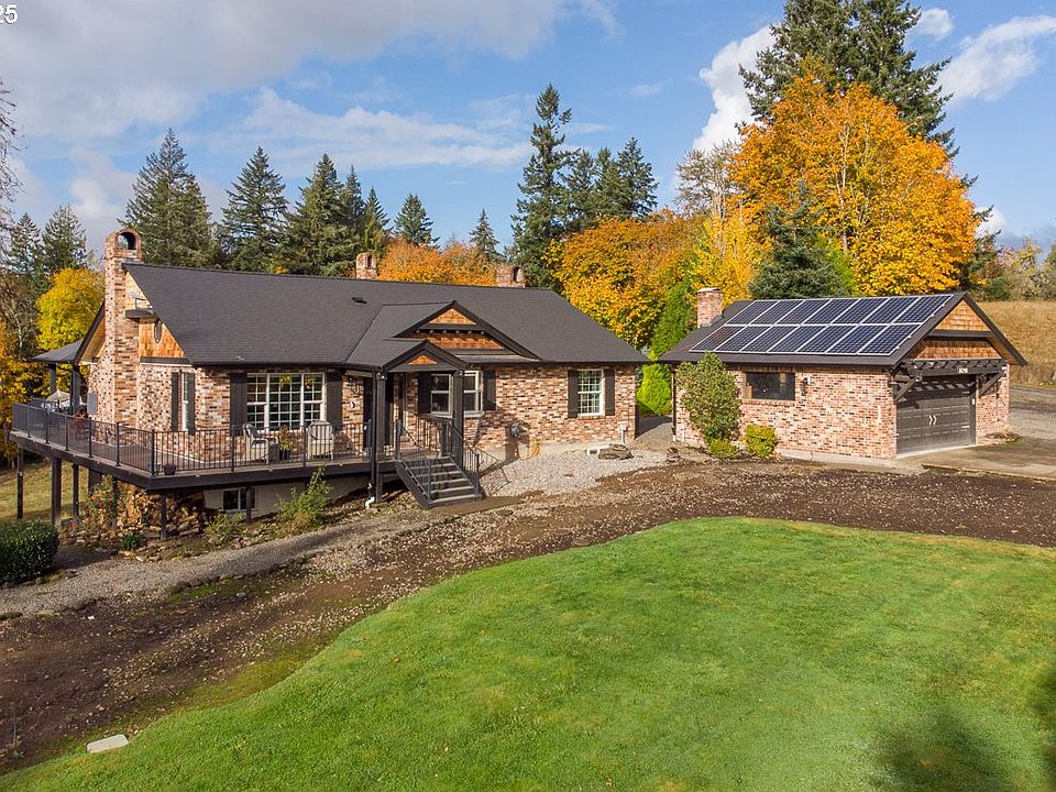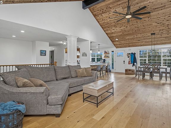 Riverfront retreat on over 5 acres along the Molalla River! Enjoy your own private swimming hole, perfect for summer fun and family gatherings. This beautifully updated home blends rustic charm with modern comfort—featuring vaulted wood ceilings, wide-plank hardwood floors, a stunning stone fireplace, and a gourmet kitchen with alder cabinetry and quartz counters. Relax in the cedar sauna or unwind on the covered deck overlooking the river Live fully off-grid with solar power, battery backup, private well, septic, and Starlink high-speed internet included. Detached garage and workshop space. A rare mix of privacy, sustainability, and riverfront living.