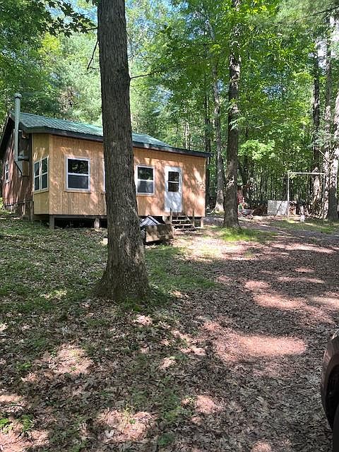 Newer rustic 2 bedroom cabin, on a 200x200 wooded lot, offers living room, kitchen and 2 bedrooms. In 2022 seller added an 8x24 front addition(not finished) that could have multiple possibilities. Metal roof in 2022. New Amish built 12x24 shed (2022) and an outhouse. Carry water from the nearby spring. Low taxes and private.