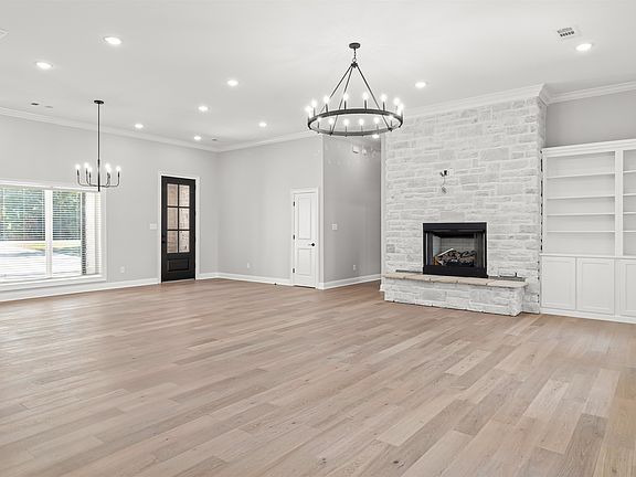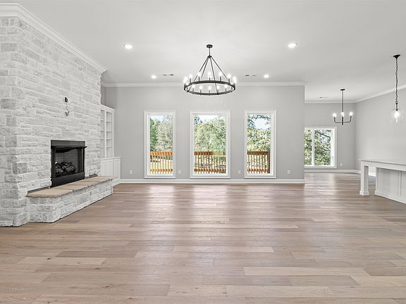 This brand-new home is located in the Terra Hills subdivision and is situated on nearly 3-acres of land. Filled with trees and beautiful countryside, this lot has waterfront access to the pond photographed. When walking through the front entrance you're met with high ceilings and large windows that show off the beautiful landscaping and covered porch in the back. The main floor kitchen is separated from the living area by a center island with quartz countertops. A few special features include the professional grade gas stove as well as an oversized double-sided refrigerator & freezer, all in close proximity to the butler's pantry. There are bricked gas fireplaces on each floor. The master bedroom on the main floor features two master closets, a large master bathroom with an oversized shower that has double shower heads on each side, a clawfoot soaker tub, and his and hers sinks.