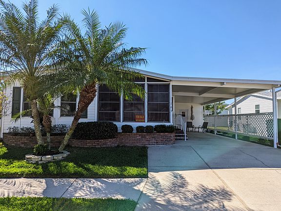 Lots of boxes can be checked at this lovely home surrounded on all sides with beautiful landscaping with new irrigation! Starting out with a 2015 shingled roof, a 2016 air conditioner PLUS the vapor barrier and tie downs were done JUST 2 years ago... Wow! You will also find some nice highlights in the big kitchen, such as updated bright white cabinets topped with granite countertops, new backsplash, a new island, breakfast bar, and stools, loads of cabinets, as well as 2020 stainless steel appliances in this almost 1400 SF Jacobsen manufactured home. Complete with 2 bedrooms, a good size den with bay windows, large living room, the dining area has plenty of room for a table and 6 chairs and indoor laundry. This is a very inviting and comfortable home that is freshly painted a neutral color, natural light floods the rooms through double pane windows. This house is sold turnkey and has everything you need to start living your retirement in sunny Florida. Located in the most sought-after 55+ active community that is pet friendly. A large lanai is on the front of the home and has 2 sets of sliding glass doors that open to the den and the kitchen! Long carport with additional half driveway...enough room for 3 cars! Good size shed has overhead storage and has a rear door that goes out to a cozy little private patio surrounded by a fence and landscaping. A perfect place for a quiet sunny afternoon. Additional features outside of the home include new sod in the yard, an irrigation system, and a convenient water shut-off location. Great community, friendly neighbors, close to shopping and dining, and just a short drive to Gulf Coast area beaches. Amenities include Olympic size swimming pool, hot tub, and large sundeck overlooking Palm Lake with its pretty fountain. The resort-style clubhouse is home to the state-of-the-art exercise room, library, billiard room, craft room, the ballroom hosts a variety of events such as dinners, dances, entertainment and so much more...ALL IS included in your lot as well as lawn mowing PLUS INTERNET AND CABLE plus 2 HD boxes!!! The monthly lot rent for 2023 is $922 plus taxes, you won't find a better community anywhere! One dog or one cat is allowed. All listing information is deemed reliable but not guaranteed and should be independently verified through personal inspection by appropriate professionals. Integrity Mobile Home Sales cannot guarantee or warrant the accuracy of this information, measurements, or condition of any property. Measurements are approximate. Lot rent subject to change