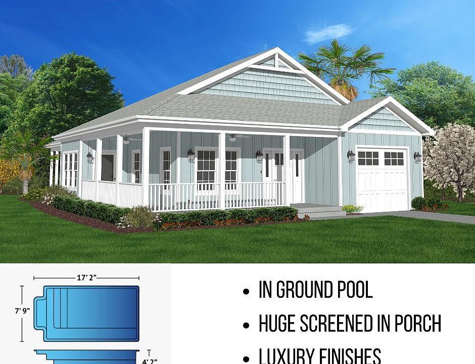 Located just a few blocks from the Beach and Intracoastal Waterway this home combines luxury finishes with an ideal location with an in-ground pool! Introducing the ''Caswell'' plan by 12 time Diamond Award winning Builder SeaCoast Homes. The wrap around porch offers a touch of southern charm to the aesthetic and an inviting option for enjoying morning sunrises and evening shade. Inside you will appreciate this carefully crafted floor plan and custom designed finishes. This airy, open concept floor plan boasts 9' ceilings with luxury LVP natural tone flooring throughout enhanced by a coastal inspired trim, door & lighting package. The spacious living room features cathedral ceiling & electric fireplace with tile & shiplap accents and stained wood mantle. The dreamy kitchen is adorned with a large island with countertop height seating and attractive pendant lighting, beautiful quartz countertops, white shaker cabinets with under cabinet LED lighting accents, tile backsplash, high-end appliances and range hood & a walk-in pantry. The dinning area takes advantage of the open floor plan offering an inviting space for breaking bread with friends and loved ones. The Large Master Bedroom offers a worthy retreat with 8'' tray ceiling a large walk-in closet with boutique shelving and a luxurious mater bath with coastal themed tile shower & dual vanity as direct access to the back covered patio. The remaining two guest bedrooms offer spacious accommodations & a Jack & Jill bath with a tiled tub/shower combo. The interior also features a spacious laundry room with cabinets. To add to your outdoor living pleasure is a HUGE nearly 20' x 10.5' covered & screened in back porch with ceiling fan creating the perfect spot to entertain and unwind by the in-ground pool. An oversized 1 car attached garage is ideal for housing a golf cart and all of your beach gear. Property also features DP50 windows, encapsulated attic & high efficiency HVAC system for optimal comfort and efficiency.