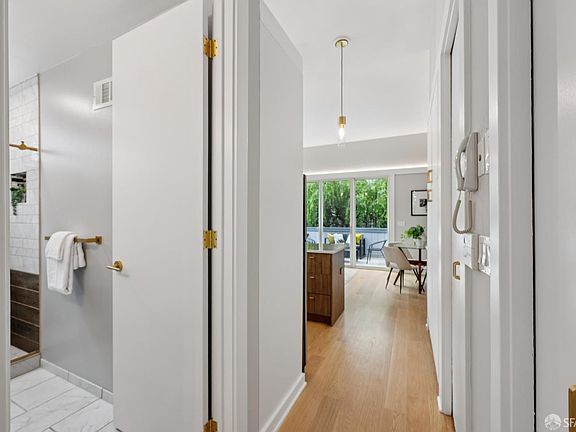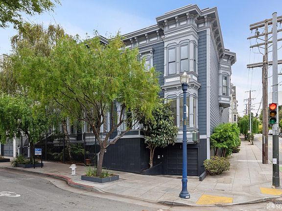 Classic Italianate architecture meets refined contemporary design at 163 Octavia. This beautifully updated top-floor 2BR/1BA condo in the heart of Hayes Valley puts the best of San Francisco at your doorstep. Hardwood floors and soaring ceilings welcome you into the central hallway. A geometric accent wall frames the bright living and dining areas, flowing naturally to the kitchen - for relaxing or entertaining. The kitchen features quartz countertops, marble tile backsplash, stainless-steel appliances, and a spacious pantry cabinet with pull-out organizers. These social spaces open to a tranquil private-use patio. Each of the two bedrooms offers distinct charms: one features a skylight with a remote-controlled blackout shade, while the other boasts a stone-clad fireplace and built-in shelving. A large office space with peekaboo City Hall views, an elegant bathroom with custom tilework, and in-unit laundry complete the home. The garage includes a private storage room and easy-access parking space. Rated a "Walker's + Rider's Paradise" and "Very Bikeable" by WalkScore.com, 163 Octavia is steps from Hayes Valley's boutiques and cafes, plus the cultural gems of Civic Center - a true urban haven.