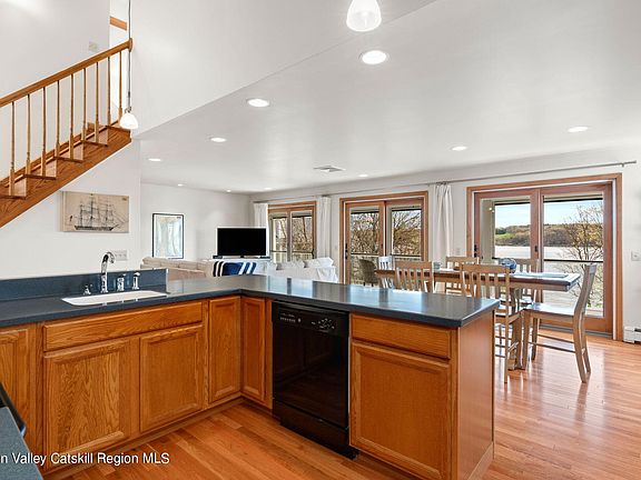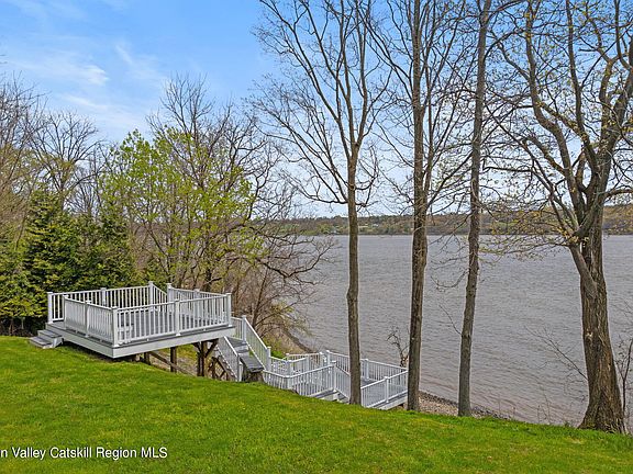 Welcome to 163 Patterson, a must see Hudson River front cape cod, nestled on a dead end street in Saugerties, NY. Upon entering the home you're greeted by the grand staircase and open concept kitchen, living and dining area. The kitchen exudes a nautical feel, perfectly complementing the riverside ambiance. A walk-in pantry provides extra storage and a prep sink, adding convenience to the space. Whether you're entertaining guests or seeking a peaceful retreat, the open concept layout caters to all needs. The living and dining areas flow seamlessly to the back porch through sliding doors, offering a picturesque view of the Hudson River and bathing the rooms in natural light. The back porch is a true gem, featuring trex decking, ceiling fans, tempered glass, and automatic screens that enclose the space for comfort and relaxation. The first floor includes a bedroom and full bath with laundry, which can easily be converted to a jack and jill style for added privacy. Upstairs, the second and third bedrooms boast large windows framing stunning sunrises and sunsets over the Hudson. A spacious walk-in closet is featured in the second bedroom. Completing the second level is a large full bath with double vanity, shower and added space for linens. An attached 3-car garage provides ample space for vehicles and storage. The full walk-out basement offers endless possibilities for customization. A pair of sliding glass doors lead to a paver patio, ideal for grilling and outdoor dining during the warmer months. A storage shed situated in the backyard provides additional space for your new river living accessories. The beautifully landscaped yard extends to a 3-tier trex decking, complete with benches on each level for you to bask in the beauty of nature abound. For those who love water activities, the custom deck with a 3 level staircase leads you down to 105 feet of Hudson River frontage. The home is perfectly situated atop a hill in a flood-free area. This river frontage property offers direct river access with no railroad tracks between the property and the Hudson. A perfect spot to launch kayaks or try your hand at fishing right in your own backyard. This property truly offers a blend of comfort, style, and natural beauty that is sure to captivate anyone who comes inside. Conveniently situated just minutes from the lively village of Saugerties, providing easy access to a variety of amenities. In close proximity to Woodstock, Kingston, Catskill, and Hudson allowing you to indulge in all the Hudson Valley has to offer. Experience the tranquility of Hudson River front living.