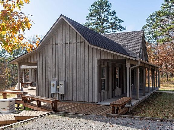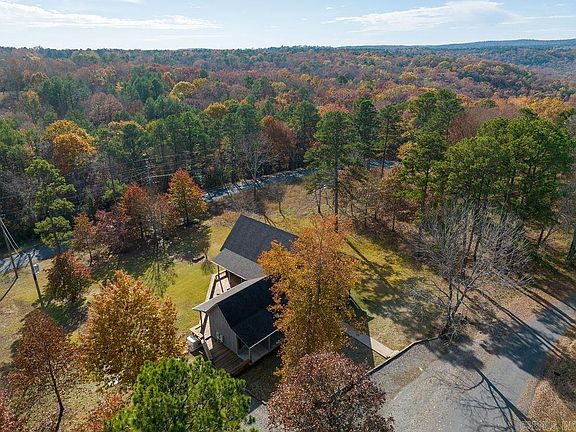 Welcome to this beautiful 1.5-story lake area home featuring 3 bedrooms and 2 baths. The large windows provide natural light into the open concept living area. The interior boasts vaulted ceilings with massive beams, a unique pickle stain finish in the kitchen, living room, and dining area, extending to the trim and cabinetry throughout the house. New LED track lighting in the living/dining area. Recently refreshed paint contributes to the ongoing care of this well-maintained property. The main level has stained concrete flooring, and the upstairs bedroom is carpeted. Outside, a deck and fire pit area provide an ideal setting for gatherings or relaxation after a day on the lake. Additional features include an inground 500-gallon propane tank and a Generac, whole house generator, both installed about a year ago, updated gutters from approximately two years ago, and a recently stripped and stained deck. This property offers the convenience of a boat launch less than a 1/2 mile at the Cove Creek Recreational Area, which also offers campsites and picnic spaces. In the winter, you will see Greers Ferry Lake through the trees from your front porch. Don't miss this opportunity!
