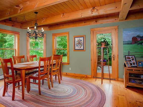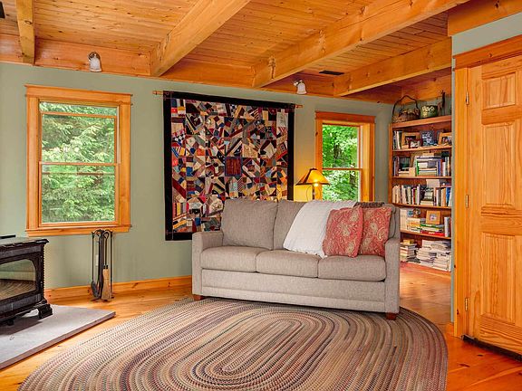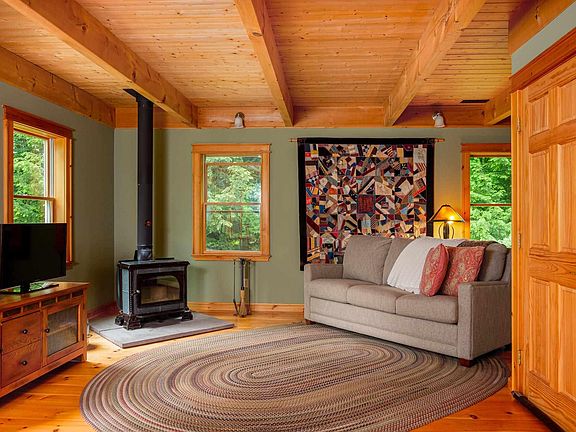 Listen to the sound of the river from this beautifully designed and crafted home. A tributary of the Huntington River is located over the bank behind the house and runs year round. Step inside to a tiled entry area and first floor bath. Pine floors through the rest of the house lay the groundwork for a home with custom details including natural woodwork, cherry window sills, exposed beams and wood ceilings on the first floor. The kitchen cabinets are natural wood topped with blue tile counters for a pop of color. With an open floor plan you'll be part of the party even while cooking. The dining area features a box bay with windows overlooking the gardens and a natural wood counter provides space for a buffet or extra seating. The focal point of the living room is the Hearthstone woodstove with slate on the exterior. With southern & eastern exposure this home is sunny and bright. The deck on the south side is the perfect spot for relaxing. Ascend the stairs with its custom cherry rail and hand-forged iron details to 3 bedrooms and another full bath. You'll find room for a desk or reading area at the top of the stairs. The full unfinished basement has a wall lined with four windows allowing for future expansion. The 1.5 car garage has room for a vehicle, the generator and yard and garden tools. Lovely gardens bloom from spring through summer and stone walls and steps accent the landscape. Simple design & quality materials add up to a quality home. Come see! Showings begin 6/18.