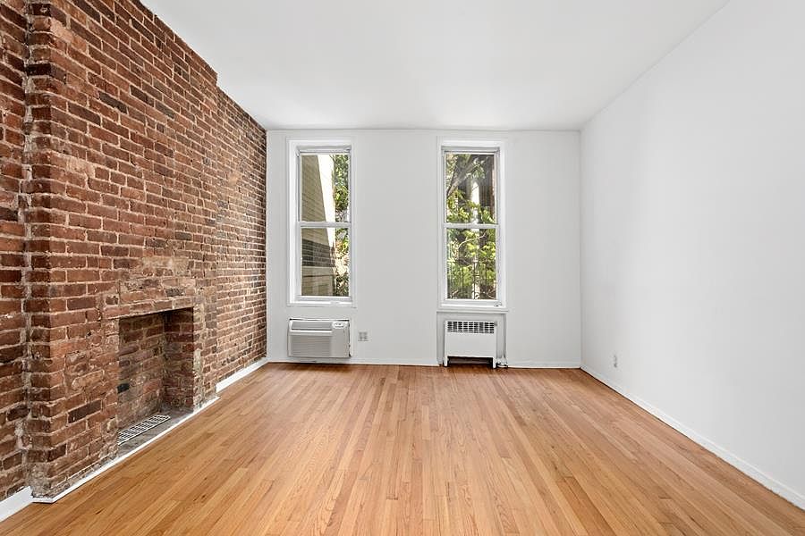 This bright and inviting studio combines pre-war charm with a peaceful setting. The spacious layout features beautiful solid oak hardwood floors, soaring ceilings, and a striking exposed brick wall with decorative fireplace. Oversized eastern windows bring in natural light and overlook a lush garden, creating a serene backdrop.