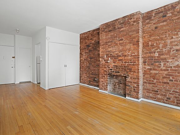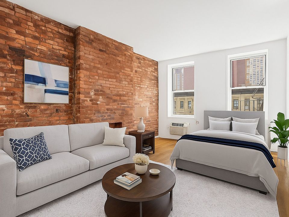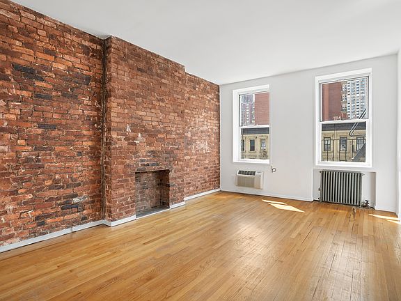 Just one flight up, this sunny and oversized studio offers charming prewar details with modern appeal. Enjoy open western exposure overlooking a lush tree line on Second Avenue, bathing the apartment in natural light. The home features solid oak hardwood floors, an exposed brick accent wall with a decorative fireplace, and a built-in wall AC unit for year-round comfort.