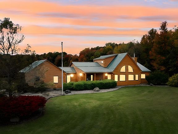 This stunning near 35-acre property is a true rural retreat, this rolling hill acreage has beautiful, exquisite design log home perched on a hill overlooking beauty of nature and nestled among woods and open fields. The main living area boasts stunning views of the pond and hills with trees and also a horse stable. Gather your friends and family around this generous dining table and kitchen in this open concept log home. Only a little over an hour away from Chicago and close to all that Harbor country has to offer.