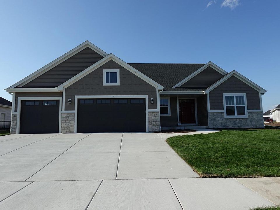 3 bedrooms/2 full baths/ranch design. Basement has 1 egress slider window & drain/vent rough-in for future full bath. Ceramic tiled master shower/double sinks master & family baths w/granite or equivalent vanity tops. Large WIC master suite. 9' main floor ceilings: pitched in foyer, living room, kitchen, dinette & tray in master bedroom. Kitchen cabinets are staggered w/cabinet crown moulding/granite or equivalent countertops/island w/sink/pantry closet. Spacious laundry/mudroom w/drywall lockers, cabinets & sink. Covered front porch. 3-car garage with large storage area (17'7'' x 12'1''). Buyer added kitchen backsplash, master shower door, car charging wiring garage, concrete driveway, walkway to front entry, patio & sod lawn. Buyer upgraded plumbing fixtures, dishwasher & carpet pad.