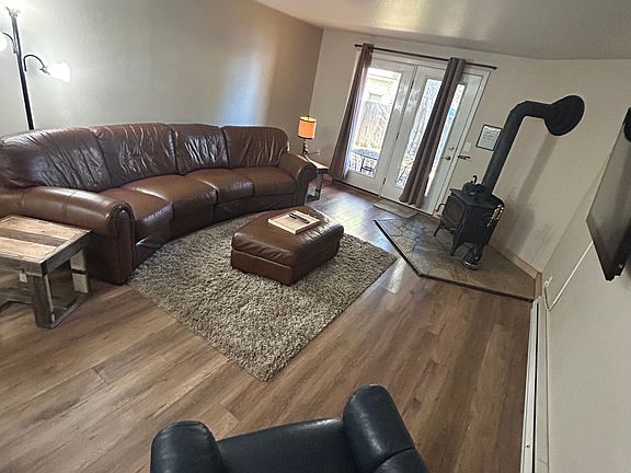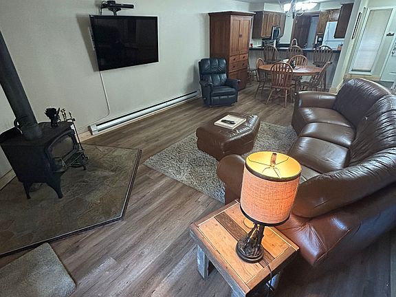 Cozy living room featuring a wood stove for warmth and ambiance during McCall's snowy winters