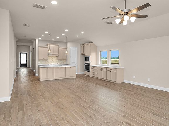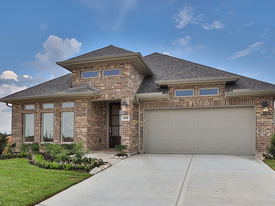Entry with 13-foot ceilings framed by game room with French doors. Extended entry flows to the kitchen and dining area. Island kitchen with built-in seating space, 5-burner gas cooktop and a corner walk-in pantry. Family room with a wood mantel fireplace and wall of windows. Secluded primary suite. Primary bath offers dual vanities, garden tub, separate glass enclosed shower and two walk-in closets. Guest suite with a full bathroom and a walk-in closet. Secondary bedrooms and a utility room complete this one-story design. Covered backyard patio. Mud room just off the three-car garage. Representative Images. Features and specifications may vary by community.