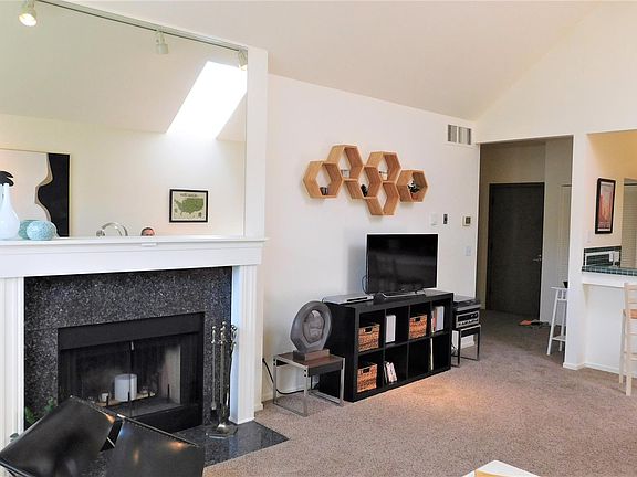 -Living Room features a wood burning fireplace, flat screen TV and track lighting. Skylights and vaulted ceilings allow an abundance of natural light. Access to balcony.