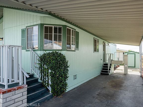 San Dimas Royal mobile home ready to move in, just needs a little cosmetic updating. This 55+ park is highly sought after with amenities and a community pool. Nice front curb appeal with bushes and steps leading to a spanning covered front deck and a covered carport on the side. The front door opens to a spacious family room with a fireplace and is open to the large kitchen. The kitchen offers wood cabinetry, corian countertops, a stainless steel range and refrigerator, a walk-in pantry, island, and a dining area that overlooks the family room. There is a master bedroom with ensuite master bathroom that offers a walk-in shower, separate tub, and a sink. The second bedroom is off the hallway along with a hall bathroom and a laundry room with a door leading to the steps going down to the carport.