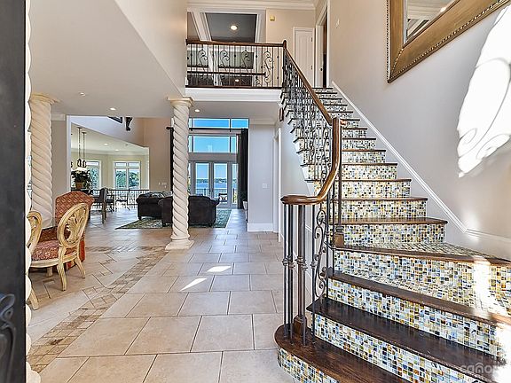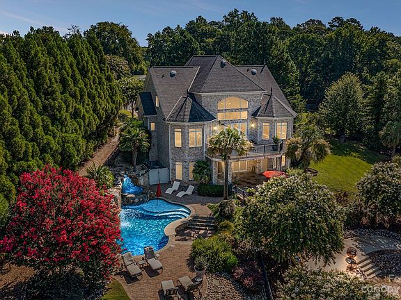 Welcome to Mariners Watch Ct, a breathtaking oasis nestled on over 0.90 acres with 450+ft of shoreline on Lake Wylie's main channel. This custom all brick home boasts panoramic lake views from almost every room and features cathedral ceilings, hardwood floors, and an open concept living space. With 4 bedrooms and 5 bathrooms spread across 3 light-filled floors, this home offers a truly luxurious experience. The fully finished basement is an entertainer's dream, complete with a bar area, media room, game room, and workout area. Step outside to your own private paradise, featuring a fabulous inground pool and spa, 2-level dock with boat slips, and a patio with a built-in grill and fireplace. Don't miss the opportunity to witness picturesque sunsets from the gazebo. This home is truly a masterpiece.