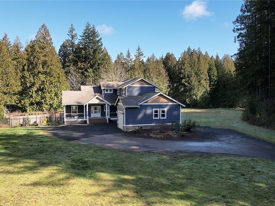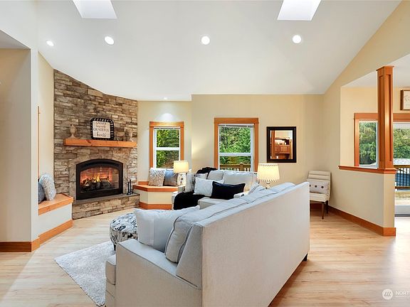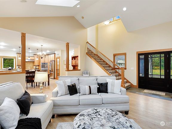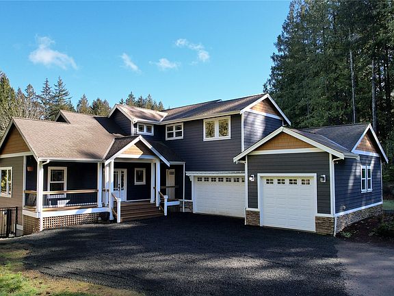 Stunning craftsman on a gated 5+acre lot w/over 3300sf of living space. Expansive, level, usable land w/custom landscaping, outbuildings, & fully fenced area. Inside: light-filled ambiance accentuated by tall ceilings & open living concept with custom stone hearth & mantle embrace cozy fireplace. Kitchen dazzles w/abundant storage, large island, & panoramic views of the property. Upstairs: 2 bedrooms plus primary suite featuring a private balcony, luxurious soaking tub w/dual-sided fireplace, & custom stone-tiled shower. Downstairs: spacious family room w/backyard access, kitchenette, full bath, bedroom & ample storage space. Experience the charm of Seabeck's amenities just 15 minutes away from Silverdale.