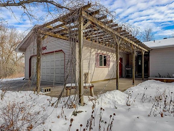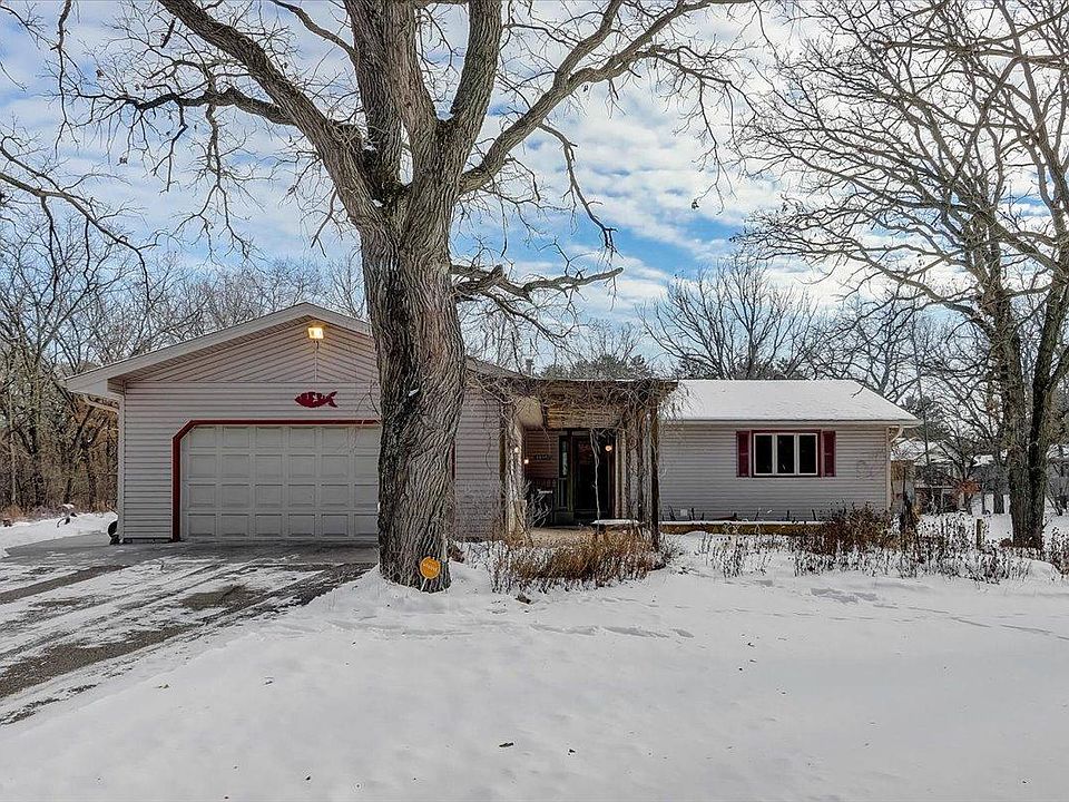 Beautiful home on a quiet cul-de-sac. This desirable location offers seclusion & access to shopping/eateries. Set on 2.5 acres that adjoin a wetland. Enter the foyer fo this 4 Bed/ 2 Bath home and into the living room with vaulted ceiling and wood burning fireplace. Open concept brings together the dining room and kitchen. Off the living room, a light and bright sunroom with wonderful serene, nature immersion, and several raised gardens . Natural cedar woodwork throughout the main level. The main level hosts 3 bedrooms, including the Primary and a full bathroom. 4th bedroom and additional bathroom are located on the lower level. Lower level also includes a large family room with a second fireplace, laundry room, and more storage. The lower level also features tongue and groove pine throughout. Front and back patio feature stamped concrete. Detached 2-stall garage with ample space for storage of extra cars, recreational vehicle, or a potential workshop. Call this one home!