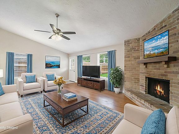 Welcome to 16302 Cypress Point Dr situated in the established Cypress Point neighborhood. This home offers an open floorplan with approximately 1,556 square feet of living space features 3 bedrooms and 2 full baths. The home has been freshly painted with neutral color tone. The kitchen features white cabinets, granite counter tops a separate dining room they both open to the living room. The living room features cornered brick veneer fireplace, laminate wood flooring plenty of natural lighting. Cypress Point community offers pool, clubhouse, Cy-Fair schools, with easy access to major highways, dining options and shopping. Don't miss out on this opportunity. Lawn is virtually enhanced and property virtually staged. Items will not appear to be at property.