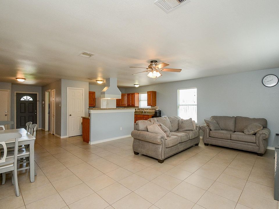 This charming single-story home sits on a quiet cul-de-sac with quick access to I-10. Featuring 3 bedrooms, 2 full baths, and a spacious open-concept layout, it’s perfect for both everyday living and entertaining. The kitchen offers granite countertops, a double sink, pantry, and breakfast bar for extra seating or workspace, all open to the large family room filled with natural light. The private primary suite includes two closets and an en suite bath, while the split floor plan provides privacy for the secondary bedrooms. Enjoy tile and wood-look laminate flooring throughout—NO carpet! Added highlights include ceiling fans, a foyer with coat/storage closet, and a 2-car garage with a wide driveway. Step outside to a backyard with a deck and storage shed that stays with the home. Washer/dryer and refrigerator stay with the home!