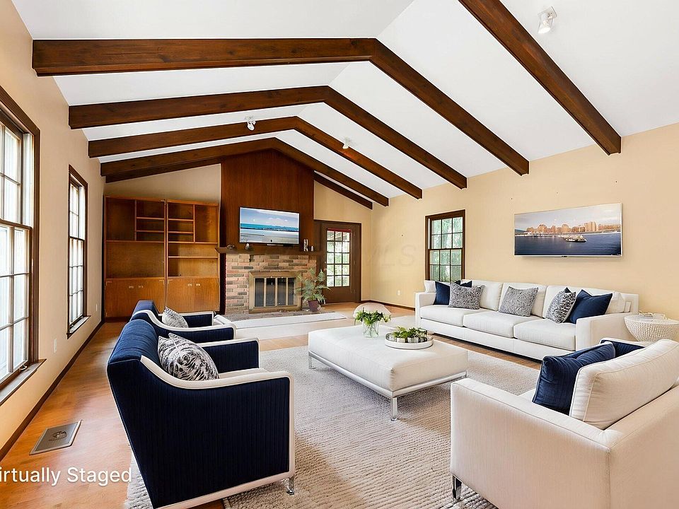 Second fireplaceLovely ravine viewsCustom built-insBeamed ceilingEnormous family roomTraditional fireplaceGood closet space