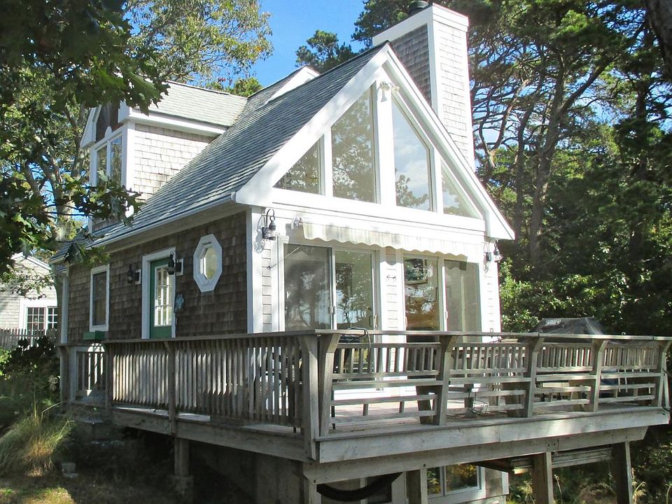 Front Row VIEW! Substantial 2 bedroom cottage sits up close to the ever changing tidal beauty of Drummer Cove. Recently renovated, not much remains of 1950s vintage except the charm! New siding, trim board, gutters, deck & outdoor shower. Living area is open to the rafters w/ gas fireplace, wood floors, & floor to ceiling windows that offer a dramatic view from the top of the pines to the marsh & bay beyond. Kitchen has dining area & breakfast bar w/ granite counters, Italian floor tile, custom cabinets & built ins plus laundry area w/ stack washer/dryer. Upstairs the master bedroom repeats the view & offers a small private 1/2 bath. The downstairs bunkroom takes a majority of the large footprint of the cottage and allows room for sleep & living space. A path to the shoreline for kayaking, boating birding & more. Great rental history!