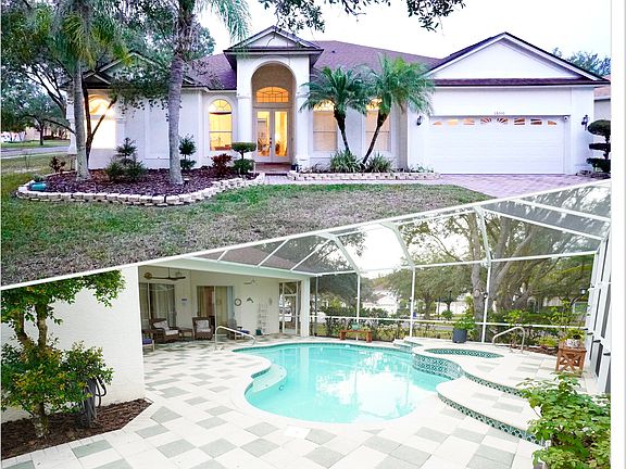 This beautiful home for rent is in the highly desirable Ashington neighborhood located within the unique and sprawling Tampa Palms community. Situated comfortably behind the gated entry, this home offers access to the exclusive amenities and resort-style living such as the clubhouse, large pools and play areas, tennis courts, and exercise facility. Having one of the larger corner lots in the neighborhood, the yard wraps around the house from front to rear access of the lanai. Shade is provided by several mature oak trees and palms. Fresh exterior paint and a new roof have been completed last year for a fresh look. This spacious floor plan offers 4 bedrooms and 3 full bathrooms, with a bright and elegant master suite that offers a his and hers walk-in closet. Luxuriously high ceilings throughout connect the open floor plan with pool access from the rear bathroom through the two living spaces and into the Master. More than 850 square feet of brand-new rigid core vinyl plank flooring brighten each of the bedrooms. Large windows and sliding glass doors allow maximum light from all times of the day. At the center of the home is a brightly lit white and stainless-steel chef's kitchen with new microwave, oven, massive double-basin sink, faucet, and dishwasher with Corian countertops. It offers a generously sized island with an eat-at wrap around bar. Walking in through the column accented main entrance of the home hangs a brand-new Z-Lite chandelier with a large matching chandelier in the formal dining room. The 1400+ square foot freshly sealed patio offers a relaxing covered area with a large three-blade ceiling fan for maximum air flow on hot Florida days. Relax in the hot tub that boasts a brand-new high BTU heater that can also heat the large luxury gunite pool when the temperature drops. Walk around the rear of the home to gain access to the serene pond-view. The A/C ducts have been professionally sanitized and cleaned recently for clean air delivery as well. Located in New Tampa, there is easy access to I75, I4, great restaurants, public parks and bike trails, Moffitt Cancer Center and USF. Tampa Palms local elementary, middle, and high school also make commute for the kids close by. $75 Application fee per adult, $500 non-refundable pet fee per pet.. First month's rent and security deposit. Renter's insurance policy required. Currently being painted, available to view.