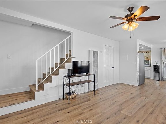 The main living space is conveniently located downstairs, complete with a remodeled half bath. Step outside to a private patio with a stackable washer and dryer, plus additional storage area. The kitchen boasts sleek granite countertops and a large stainless refrigerator, perfect for culinary enthusiasts.
