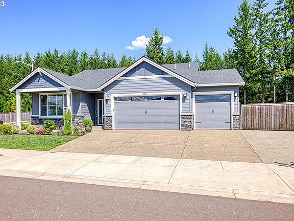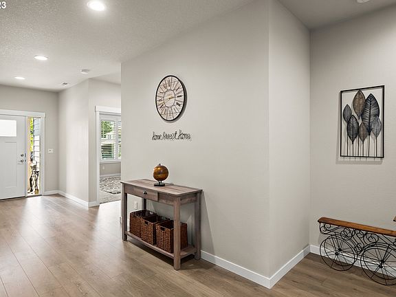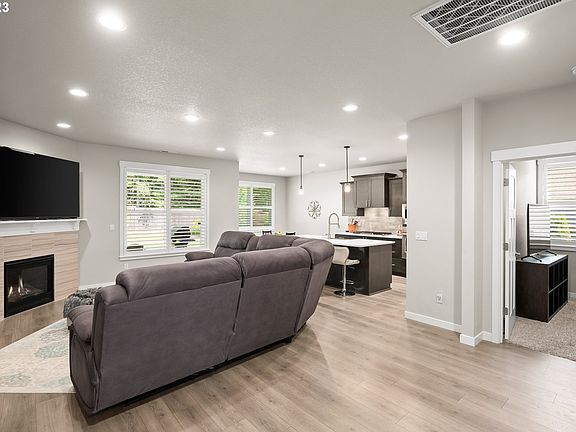 Don't miss out on this meticulously maintained 2018-built ranch home, serenely located in Oregon City's desirable Abernethy Landing neighborhood. This 3 bedroom, 2 bath home enjoys an open floor plan and upgraded amenities, such as the high-quality laminate flooring that graces the common areas, and elegant Plantation Shutters adorning the windows throughout. The living room, with its cozy gas fireplace is the hub of the home, and the adjoining gourmet kitchen boasts slab quartz counters, stainless steel appliances, pantry, stainless steel farmhouse sink, extra large gas cooktop, built-in microwave and convection oven. With access to the covered patio in the fully-fenced backyard, the dining room makes the most of indoor/outdoor living. A peaceful retreat, the owner's suite features a tray ceiling, backyard patio access, and an en suite bath with double sinks, slab quartz counter, walk-in shower, extra-deep soaking tub, plus a dream-worthy 14 x 8 walk-in closet with built-in features. Enjoy privacy and forest views in the generously-sized backyard backing to a protected Green Belt, offering ample space for relaxation, entertaining, or play. The front and backyard are equipped with a sprinkler system, and all exterior walls feature convenient electrical outlets. You'll appreciate on-demand hot water and lower energy bills from the tankless water heater. Bring your toys, there's plenty of room! The oversized 3-car garage features beautiful, low-maintenance epoxy flooring and exterior access to the backyard, and a gated RV or boat parking pad with electrical hook-up. Schedule your showing today and make this dream home yours!