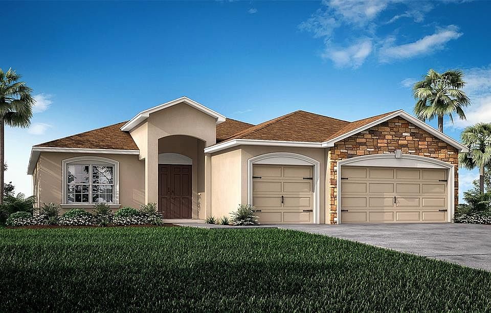New construction home with 2312 square feet on one-story including 4 bedrooms, 3 baths, and an open living area. Enjoy an open kitchen with burlap cabinets, Samsung stainless steel appliances, a walk-in pantry, and a large breakfast bar, fully open to the dining café and gathering room. The living area, laundry room, and baths include luxury wood vinyl plank flooring, with stain-resistant carpet in the bedrooms. Your owner's suite is complete with a walk-in wardrobe and a private en-suite bath with dual vanities, a large tiled shower, and a closeted toilet. Plus, enjoy a covered lanai, 3-car garage, custom-fit window blinds, architectural shingles, energy-efficient insulation and windows, and a full builder warranty. “Please note, virtual tour/photos showcases the home layout; colors and design options in actual home for sale may differ. Furnishings and decor do not convey.