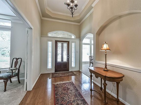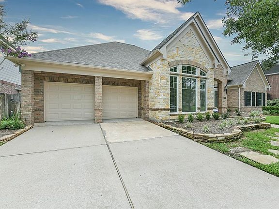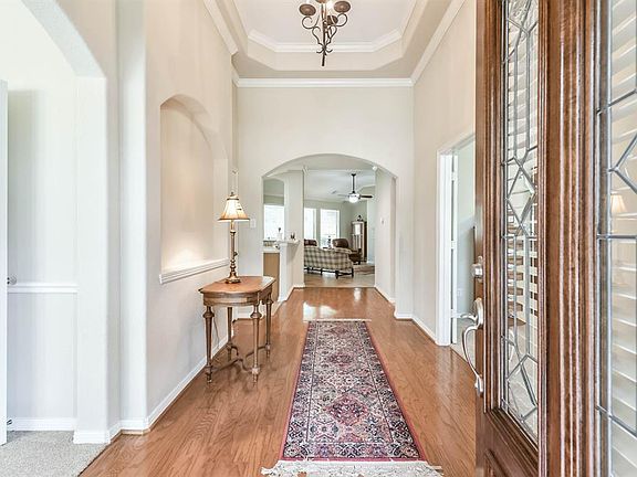 Grand Newmark design in the Estates of Fairfield, a peaceful wooded neighborhood. Rare Opportunity for a larger one-story home on a quiet culdesac street. All sides brick construction, stone front accent. 3 Car Tandem garage w/large storage closet, side exit door to yard. Garage features an extended Portico cover. Full automatic sprinkler system. Wonderful shady covered back patio. Backs up to trees and loads of privacy! Inside is fresh and neutral w/ high ceilings throughout, extensive crown moulding. Private study w/double French doors. Dining connected to kitchen via the Butler's pantry. Kitchen is spacious and open with a large central island, raised wrap around breakfast bar. Bay window breakfast. Gas Log Fireplace. Primary bedroom is split from secondary bedrooms and is extended with a circular retreat area perfect for reading and enjoying the views. Corner jetted tub, separate vanities, huge walk-in closet. Separate powder bath. Interior utility w/space for extra fridge.