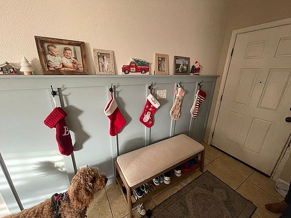 - Board & batten accent wall with hooks — a stylish, functional entry/drop zone