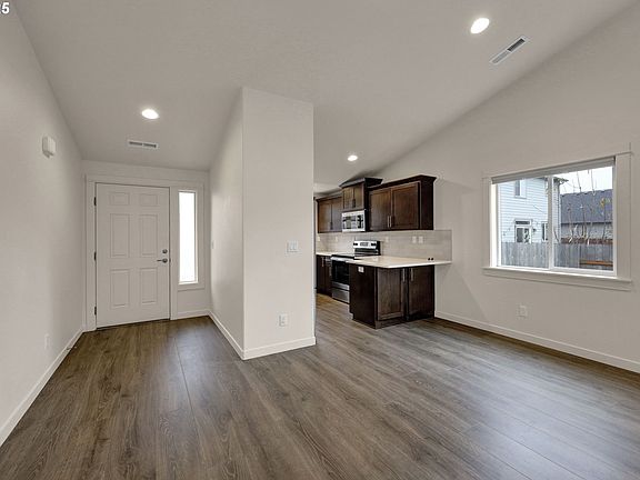 Almost new construction in an excellent Springfield location! Just minutes to downtown, the riverfront bike paths, the university, and Autzen Stadium. Enjoy single-level living at its finest with high ceilings, luxury vinyl plank flooring, and a spacious open floorplan perfect for entertaining. The kitchen shines with quartz countertops, stainless steel appliances, and abundant storage. Relax on the inviting front porch or in the fully fenced yard. Modern comfort, style, and convenience—priced to sell! Mortgage savings may be available for buyers of this listing.