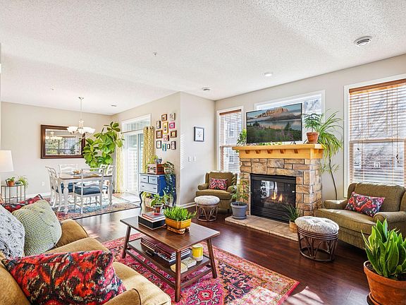 Welcome to a rarely available 3-bedroom, 3-bath end unit townhome located in the sought-after Heritage Square community of Maplewood. This sun-soaked home features a bright, open-concept layout enhanced by a wall of windows, flooding the space with natural light throughout the day. The main level offers a generously sized living room with gas fireplace, a dedicated dining space with walkout to a private patio, and a beautifully updated kitchen complete with cherry cabinetry, stainless steel appliances, stone countertops, tile flooring, and a large breakfast bar perfect for casual meals or entertaining.