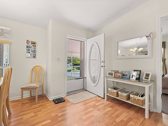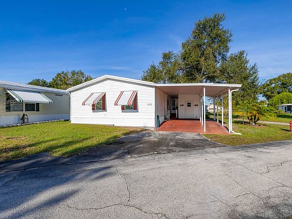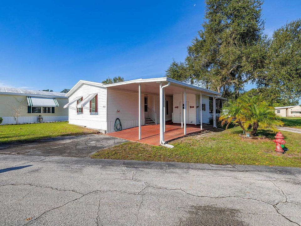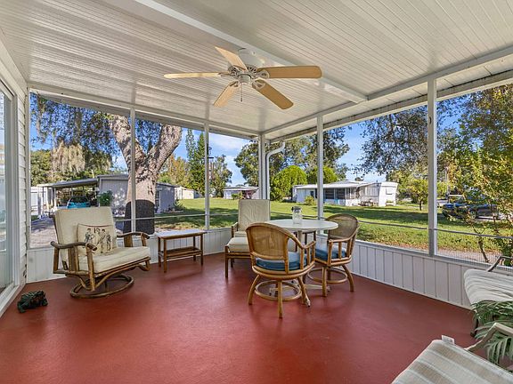 Experience the best of active retirement living in this charming 2005 manufactured home. This turnkey, two-bedroom, two-bathroom residence comes completely furnished and offers exceptional peace of mind thanks to recent major updates. A reliable foam roof and AC system, both installed in 2014, are complemented by the fact that the AC is serviced regularly for optimal performance. The interior has carpet and flooring from 2018. Enter the home to discover a highly desirable, open-concept floor plan perfect for entertaining. The spacious layout features a dedicated dining room, a pleasant dinette, and a great big living room. Notably, this home sits higher than most, lending it an elevated feel. Thoughtful upgrades include high-rise toilets, stylish marble window sills, new light fixtures, and enhanced structural security with 5 1/4 inch upgraded anchors and straps. Outside, the covered, screened lanai, accessed via a gentle wooden ramp, is tucked beneath a mature oak tree, creating a perfect, tranquil spot for daily relaxation. A useful storage shed is also included. The incredibly low lot rent of only $702 a month offers outstanding value, covering essential utilities like water, sewer, trash, and basic cable. Beyond your front door, you gain access to an abundance of world-class amenities: enjoy fitness centers, swimming pools, jacuzzi, golf or putting greens, engaging game rooms, libraries, walking paths, and a full calendar of social events. Seize this opportunity to enjoy a well-maintained home and a vibrant, fulfilling retirement lifestyle .Schedule a showing today!