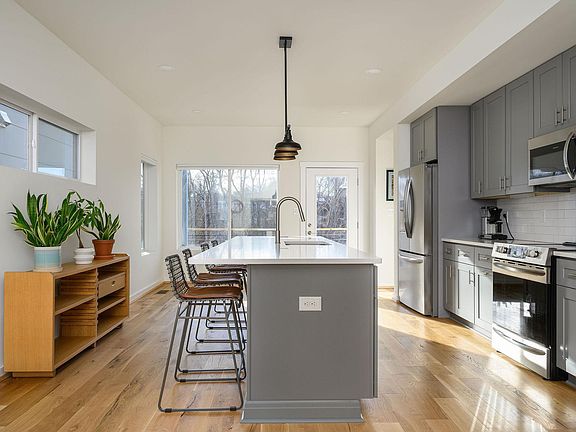 All within walking distance of city-life...this sleek, modern home located on a quiet cul-de-sac is also overlooking city-owned green space. Hop onto the noteworthy, wooded Rivanna Trail and meander by Moore's Creek or walk to the Downtown Mall, Belmont, Ix Park or 5th StreetStation. This LIKE-NEW home includes expansive energy efficient windows that allow copious amounts of natural light, custom blinds, vaulted ceilings in three spacious bedrooms, gorgeous wide-planked oak hardwoods throughout main/top level. Sought-after open floor plan with Dining Room, Kitchen & Living Room combination creates wonderful space for both hosting and comfortable everyday living. Additional custom design features include: custom kitchen (cool grey cabinetry, quartz counters, custom tile backsplash & stainless appliances), baths (custom tile selections with frameless glass shower & double vanity in the Primary Bath), extensive custom closet built-ins. Enjoy the quiet of the parkland off the Dining Room deck space and a private, spacious back deck off of the Living room.