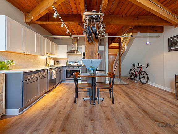 This breathtaking corner unit at Bicycle Station Lofts seamlessly blends modern sophistication with timeless charm. Recently transformed with brand-new real hardwood floors, agreeable gray paint, upgraded electrical for superior lighting and power, premium carpet, and a new HVAC system, this 1 bed/1.1 bath loft-style condo dazzles. Soaring 18-ft ceilings and expansive 13-ft windows flood the open living space with natural light, anchored by a cozy gas fireplace. The reimagined kitchen sparkles with quartz countertops, KitchenAid appliances, sleek two-tone cabinets, and a stainless steel sink with a pull-down faucet. The 2nd floor bedroom offers a spacious retreat with a walk-in closet and a refreshed bathroom featuring double sinks, granite countertops, and a glass-door shower. Authentic timber accents, modern track lighting, in-unit laundry, and a charming patio elevate the vibe. With a dedicated parking spot and a prime location near Michigan Ave, the lakefront, Soldier Field, and CTA stations, this condo redefines vibrant city living.