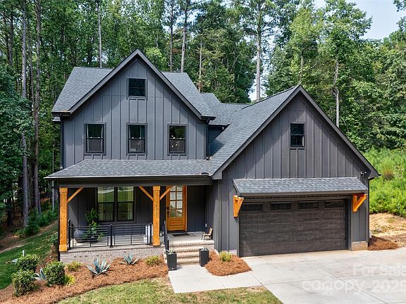 Luxury contemporary/farmhouse style at its finest. Situated on a large 1.75-acre wooded lot in the Rivers Edge community, this property is an ideal choice for those seeking a sleek, contemporary home. The custom-designed home plays with the contrasts of warm wood and dark gray paneling, creating an eye-catching entryway into this home. A private glass door study sits just off the grand entry foyer. The gourmet kitchen features ample white cabinetry, an oversized kitchen island with a single-bay sink, and ample seating space. A gas cooktop with stainless steel exhaust hood, wall oven, and custom pantry make preparing meals a joy. The open dining area flows seamlessly into the great room. Just outside the dining area is the covered deck, accented by a wood-paneled ceiling, overlooking the extended paver patio and serene wooded backyard. Truly an outdoor living paradise. The luxury primary suite has a spa-like bath with a free-standing glass-enclosed shower, dual vanities, and an ample walk-in closet. Upstairs, a second private office provides flexible space. Three spacious bedrooms and a barn door-enclosed bonus room provide ample space for the family and guests. Bedroom 2 features a hall bath, and bedrooms 3 and 4 share a Jack-and-Jill bath. This home also comes with an EV charger. Oversized garage and walk in crawl space provide lots of storage space. The community of Rivers Edge borders Lake Wylie, and is situated across the street from over 200 acres of conservancy land. Enjoy the beauties of nature and modern conveniences in this one-of-a-kind home.