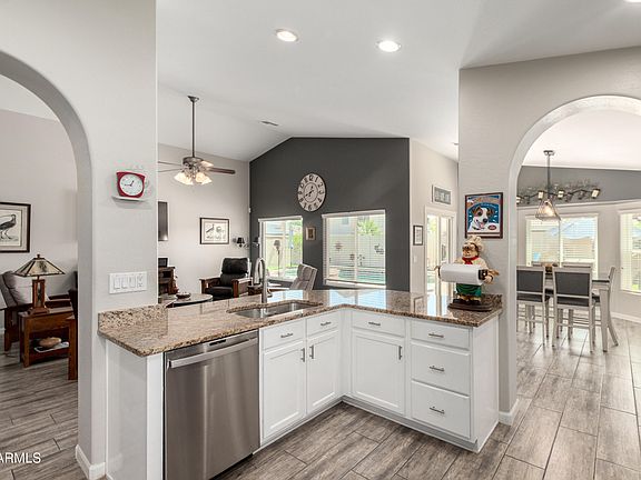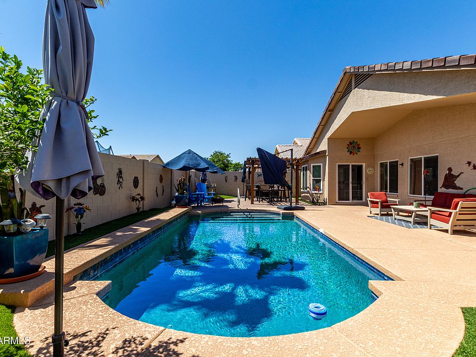 Beautifully maintained 4-bedroom home with thoughtful updates inside and out. Enjoy low-maintenance backyard complete with a pergola, artificial turf, and a sparkling pebble-tec pool perfect for relaxing or entertaining. Inside features an open floor plan with vaulted ceilings and a split layout for added privacy. Blinds and new dual-pane windows throughout enhance comfort and efficiency. The kitchen offers granite countertops and flows nicely into the main living space. The extended primary bedroom includes a walk-in shower and ample space. Recent upgrades include a new roof (2023), HVAC (2022), garage cabinets for storage, and a renovated side gate. Conveniently located near shopping, dining, schools, and parks.
