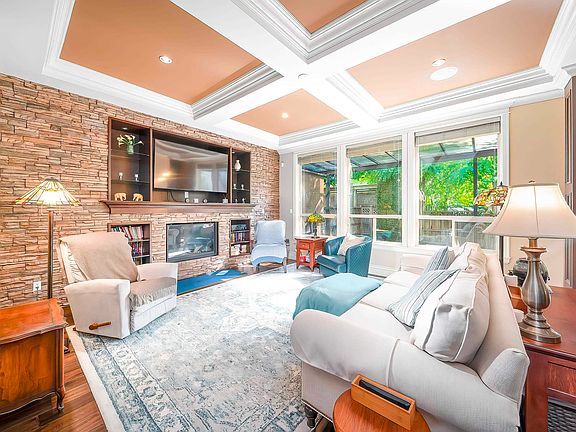 Coffered ceilingsStone fireplaceSoaring heightsBright and open atmosphere