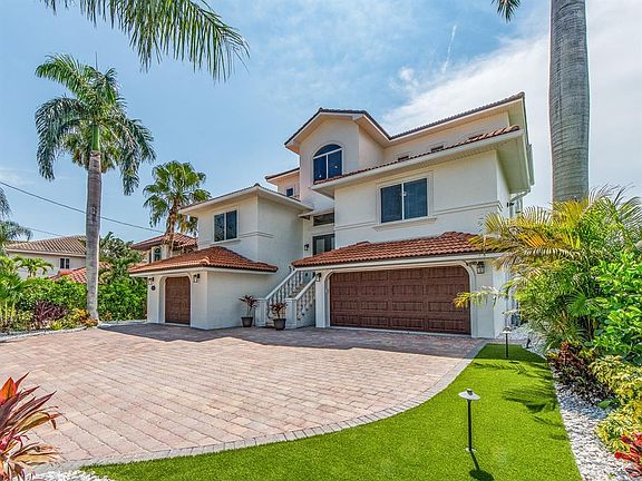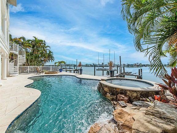 WATERFRONT LUXURY - REDINGTON BEACH - Second to none waterfront living - 5 bedrooms, 4 baths, PLUS OFFICE !! And so much more in this 2006 custom-built home; with over 3,500 sq. ft. and located on deep-water frontage, this residence has been updated with modern finishes and high-end features throughout, with sweeping water views from nearly every room. Light and bright double door glass entry introduces a large great room with elevated ceilings, combining living, dining, and kitchen areas with an expansive water view. The main floor balcony provides pool access via a spiral staircase. An updated gourmet kitchen features solid wood cabinetry, quartz countertops, stainless steel appliances, a natural gas 5-burner cooktop, potfiller, social island, and a full size adjoining laundry room with full sink. The entire top-floor is the primary suite - spanning over 1,200 sq. ft. and offering a private waterfront screened balcony to enjoy colorful sunrise and sunset views, a spacious sitting area with custom built-in shelving, dual walk-in closets, a spacious bath that feels like a day at the spa - dual vanities, an oversized dual-head shower, and freestanding soaking tub with a water view. The ground floor encompasses both garages - a one car on the left side of the home and a 2-car on the right side, and two bedrooms, bath and large rec room with access to pool deck and patio. Elevator servicing all levels of this luxury residence ensures convenience and easy access. Impact-rated storm windows and doors, tankless gas water heater, water softener, and new AC units with NEST thermostats provide maximum efficiency throughout the home. The backyard is a resort-style atmosphere, encompassing a saltwater pool and spa featuring a spillover waterfall, a self-cleaning system, and a pristine travertine patio. The firepit is the perfect spot for cozy waterfront nights, while the composite boat dock, complete with a 16,000 lb boat lift, jet ski lift, electric, and a deep-water slip ensures boating is always an option, too. A turfed and fenced side yard creates a play area and extra green space. Walking distance to the Gulf beaches, easy access to PIE and TPA, as well as shopping and restaurants. This home has it all - fresh, clean and move-in ready!