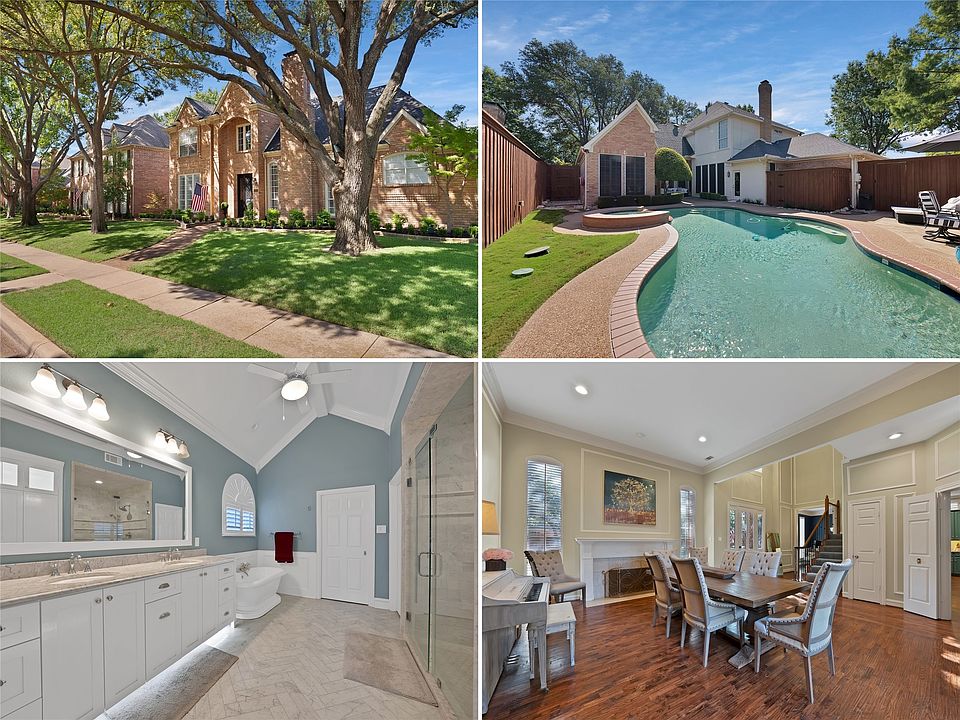 The expansive primary suite is a private haven, boasting an elegant spa-like updated bath that is sure to impress with spacious shower, designer freestanding tub, large underlit vanity and linen storage. Upstairs boasts a loft area, three nice sized bedrooms and two fully remodeled bathrooms with showers. The property’s exterior is equally impressive. Towering mature shade trees and decorative brick accents add to the home’s curb appeal. Enjoy the private backyard oasis with a sparkling pool and spa. Pool heater and filter have been recently replaced. Multiple patio spaces for your enjoyment.
