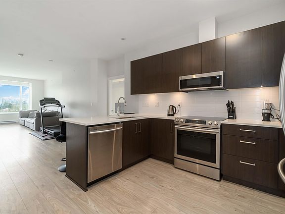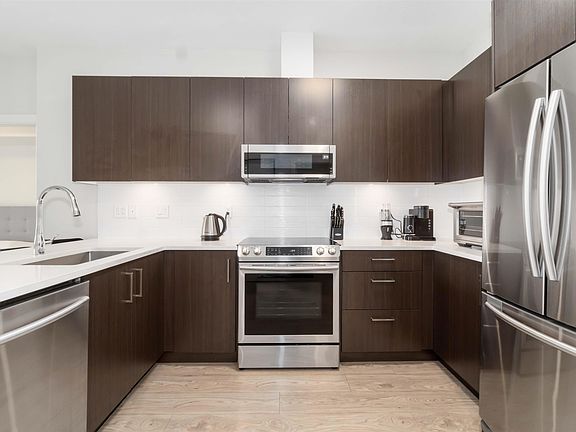 Tatlow Homes! Don't miss this PENTHOUSE beautifully designed 2 bed + large den, 2 bath in Lion's Gate Village area. This spacious home is appointed with laminate flooring, quartz counters, full-sized stainless appliances, and roller shades. Enjoy natural light streaming through large bay windows & step out onto one of TWO private balconies taking in views of Downtown Vancouver. The large primary bedroom features a walk-through closet & an en-suite with a tub, frameless glass shower, & dual-vanity countertop. This home even has a perfect office-sized den for a work from home setup. The building features guest parking, a gym, and a lobby lounge. Located near Park Royal, Ambleside Beach, & Lions Gate Village. 1 parking + 1 locker included!